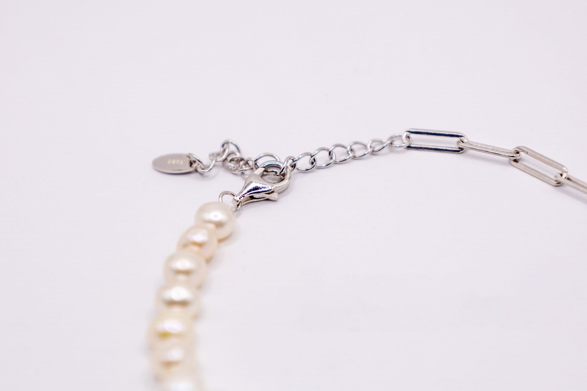 Dieses zarte Perlen-Armband vereint klassische Eleganz mit moderner Raffinesse. Die schimmernden, hochwertigen Perlen reihen sich harmonisch aneinander und werden von einer feinen silbernen Kette ergänzt. Das dezente Design macht es zu einem vielseitigen Schmuckstück, das jeden Look aufwertet – ob im Alltag oder bei besonderen Anlässen.