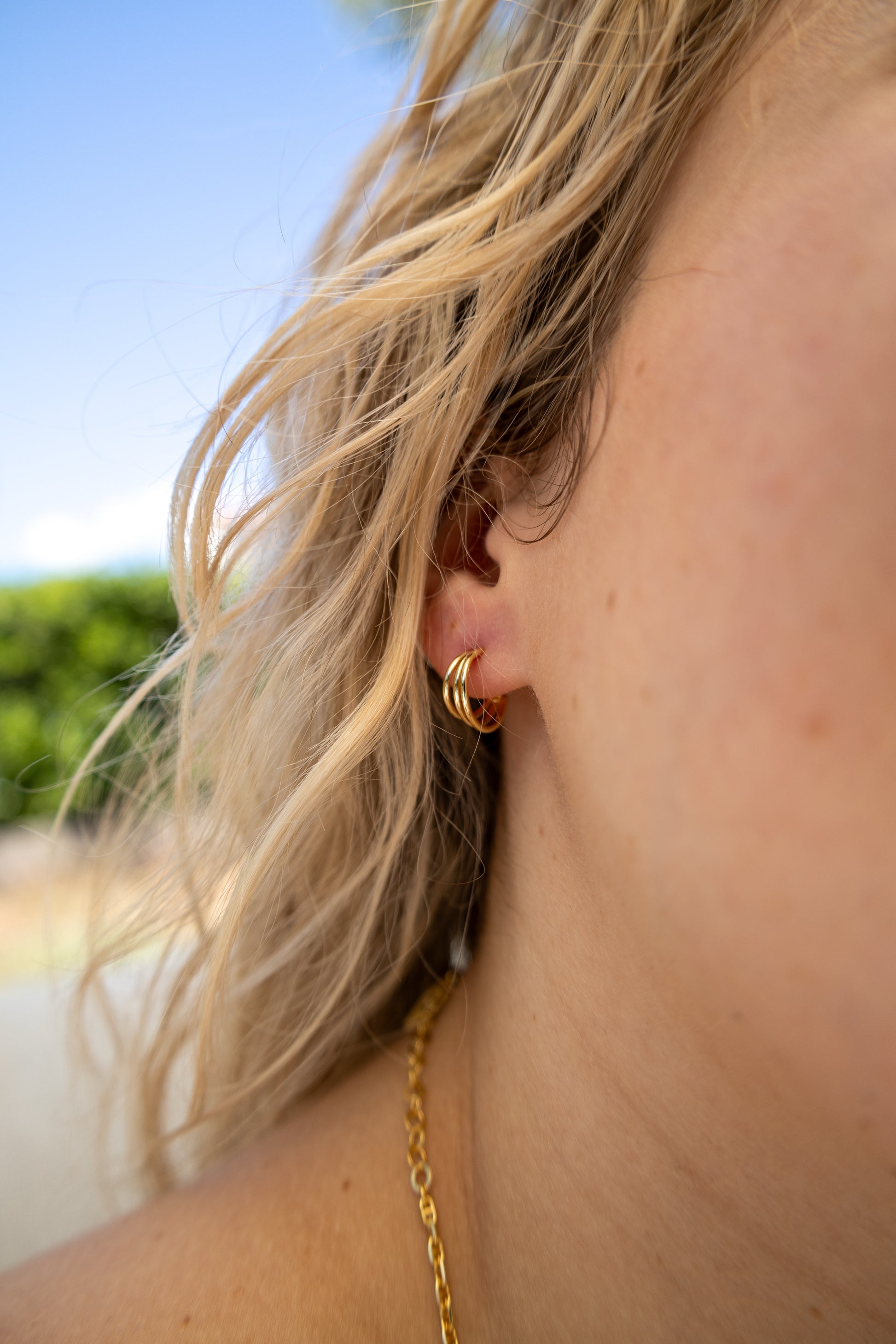 Diese vergoldeten Ohrringe aus 925 Sterling Silber bestehen aus drei dezenten, ineinander verbundenen Ringen, die einen raffinierten Look erzeugen. Das minimalistische Design kombiniert schlichte Eleganz mit moderner Raffinesse und macht sie zu einem vielseitigen Accessoire für jeden Anlass – ob casual oder elegant.